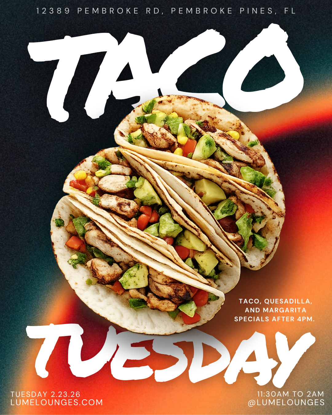 Ease into the week with flavor. Enjoy your choice of taco, quesadilla, or margarita specials after 4PM. The perfect midweek warm-up paired with good vibes and great company.